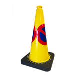 - Yellow safety cone with warning signs printed - 'No Stopping' Sign.