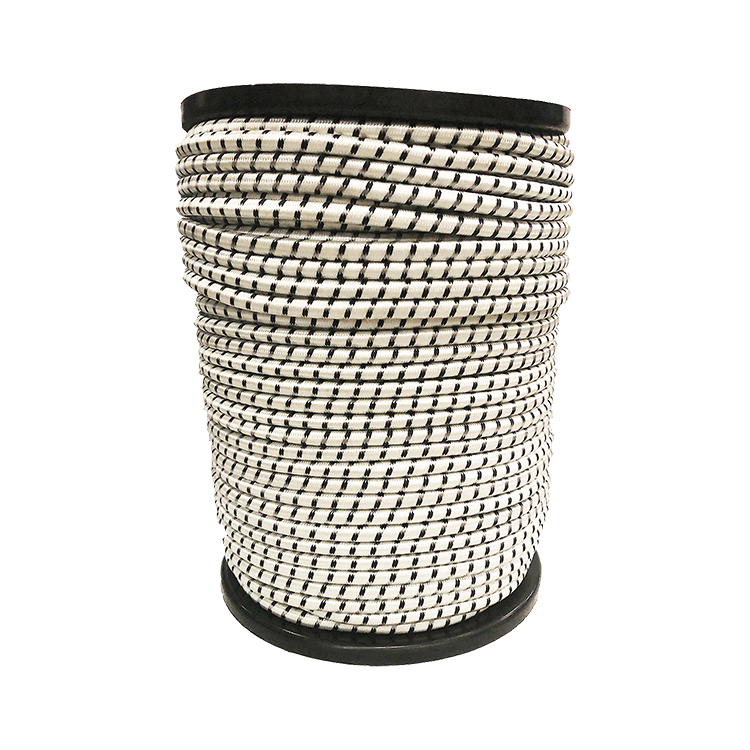 8mm Diameter Bungee shock cord Assembly in white and black fleck pattern with Metal Hooks each End.